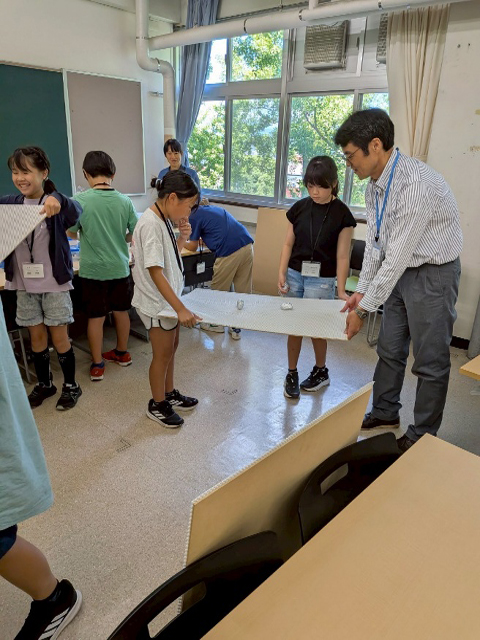 〇大石先生の講座では、先生がご用意した、くぎ・アルミホイル・スプーンなど10種類のものが「磁石につくか、つかないか」や「磁石を紙皿にのせて水に浮かべるとどうなるか」など予想をたて、実際に実験を行いました。