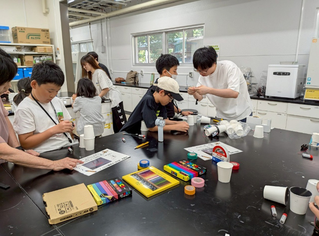 杉田先生の講座では、「三色に光る万華鏡の工作」というテーマで、紙コップ・LED電球・偏光フィルムなどを使い万華鏡を作成しました。個々に紙コップに絵をいて、お手製の万華鏡ができました。